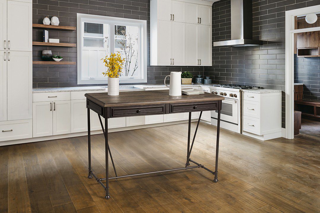 Versatility is the raison d’être for the Hillsdale Furniture Casselberry Counter Height Table. Thanks to its slender profile this counter height table is ideal as a kitchen island and sofa or console table. Constructed predominately of Brown metal with pipe legs and bun feet. This table features a Distressed Walnut wood top and two convenient pull-out drawers on one side. Make any room more inviting and functional with the Casselberry Counter Height Dining Table. Some assembly required.