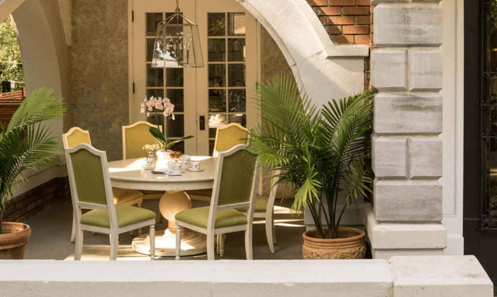 Round or oval tables can be great for parties and conversation because there’s no head of the table, too. In terms of squeezing people in, you’re only limited by the perimeter of the table — but you can lose a little space for serving pieces once you have all your place settings at a round or oval table.