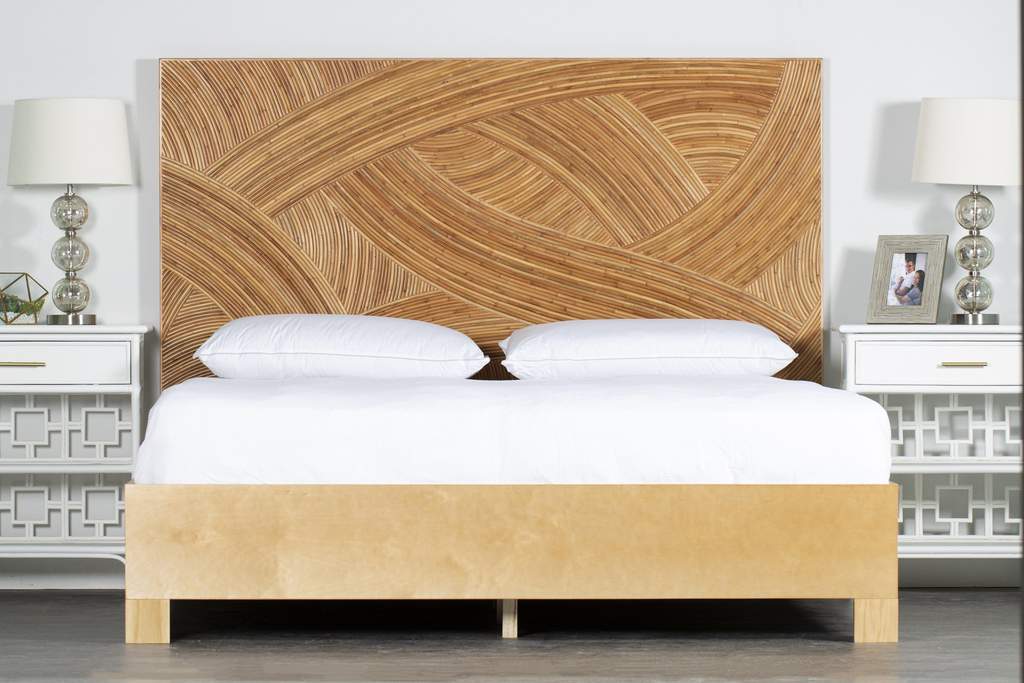 This bed features a Rattan and Mahogany headboard with a Maple Bed Frame. The headboard is designed with pencil rattan veneer in a swirl pattern. The Maple Bed Frame is available as a Standard bed frame, to accept a mattress and box spring, or as a Platform style bed, which accepts a mattress only. The headboard easily attaches to the bed frame. Each bed is customs made and finished to order in the USA. This bed is an artistic centerpiece and will make a statement in any room. Constructed by master craftsman and easily assembled, this bed is built to last.